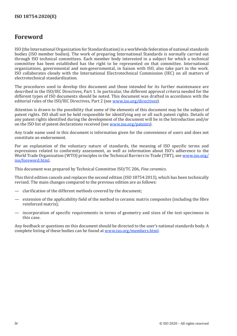 ISO 18754:2020 is a standard published by the International Organization for Standardization (ISO). Its full title is "Fine ceramics (advanced ceramics, advanced technical ceramics) - Determination of density and apparent porosity". This standard covers: This document specifies methods for the determination of the apparent solid density, bulk density, apparent porosity and geometric bulk density of fine ceramics, including all ceramic matrix composites. Two methods are described and are designated as Methods A and B, as follows: - Method A: Determination of bulk density, apparent solid density and apparent porosity by liquid displacement (Archimedes' method). NOTE 1 This method is not appropriate for the determination of an apparent porosity greater than 10 %. For materials with higher porosity, the accuracy of the measurement might not be satisfactory. This method might also not give a satisfactory open porosity result if it is less than 0,5 %. NOTE 2 This method is also not suitable for materials which are known to have an average pore size of greater than 600 µm. - Method B: Determination of bulk density only, by measurement of geometric dimensions and mass.