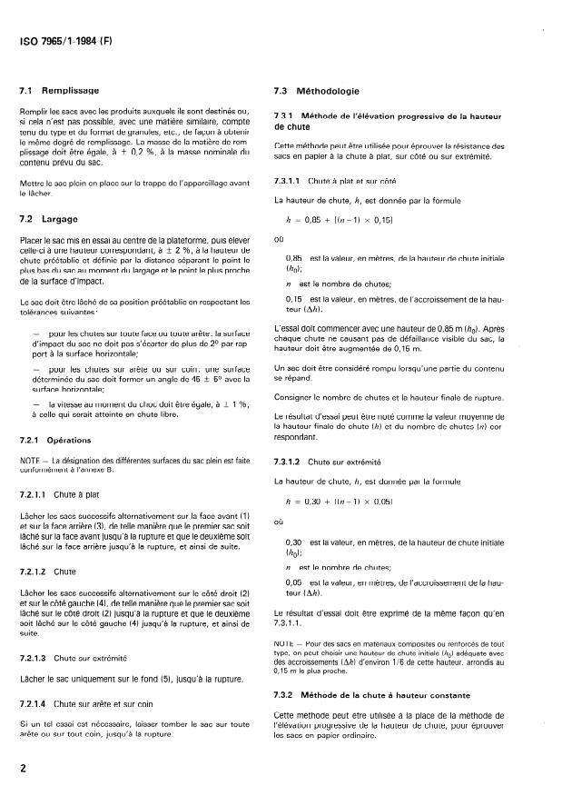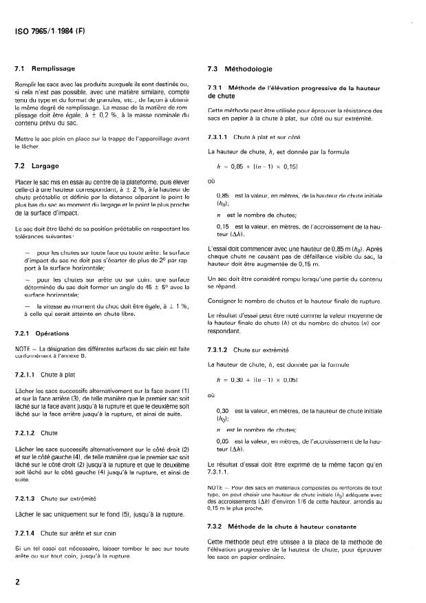 Principle: The filled sack is raised above a rigid plane surface and released to strike this surface after free fall, the atmospheric conditions, the height of drop and the position of the package being set in advance. Various kinds of dropping are described. Test methods with progressive and constant drop height and limit height are specified. Annexes show examples of apparatus for drop testing, identification of surfaces of sacks and example of format for a drop test report.