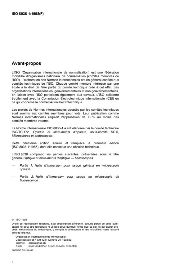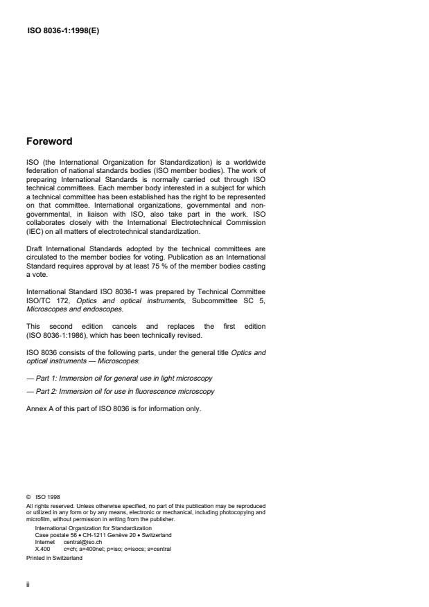 ISO 8036-1:1998 is a standard published by the International Organization for Standardization (ISO). Its full title is "Optics and optical instruments — Microscopes — Part 1: Immersion oil for general use in light microscopy". This standard covers: Optics and optical instruments — Microscopes — Part 1: Immersion oil for general use in light microscopy