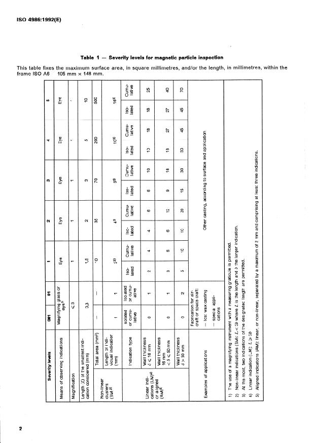 ISO 4986:1992 is a standard published by the International Organization for Standardization (ISO). Its full title is "Steel castings — Magnetic particle inspection". This standard covers: Specifies a test method for determining the acceptance limits of surface discontinuities detected by magnetic particle inspection, when such an inspection procedure has been contractually agreed upon at the request of the purchaser. Applies to all magnetic steel castings, whatever casting process is used.