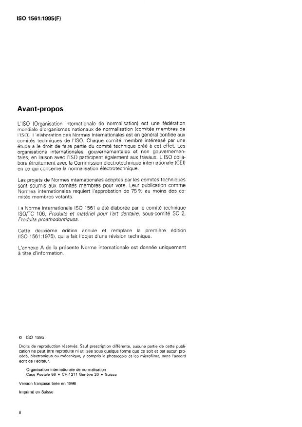 ISO 1561:1995 is a standard published by the International Organization for Standardization (ISO). Its full title is "Dental casting wax". This standard covers: Specifies the classification of and requirements for dental casting wax and describes test methods for the determination of compliance with these requirements. Replaces the first edition, which has been technically revised.