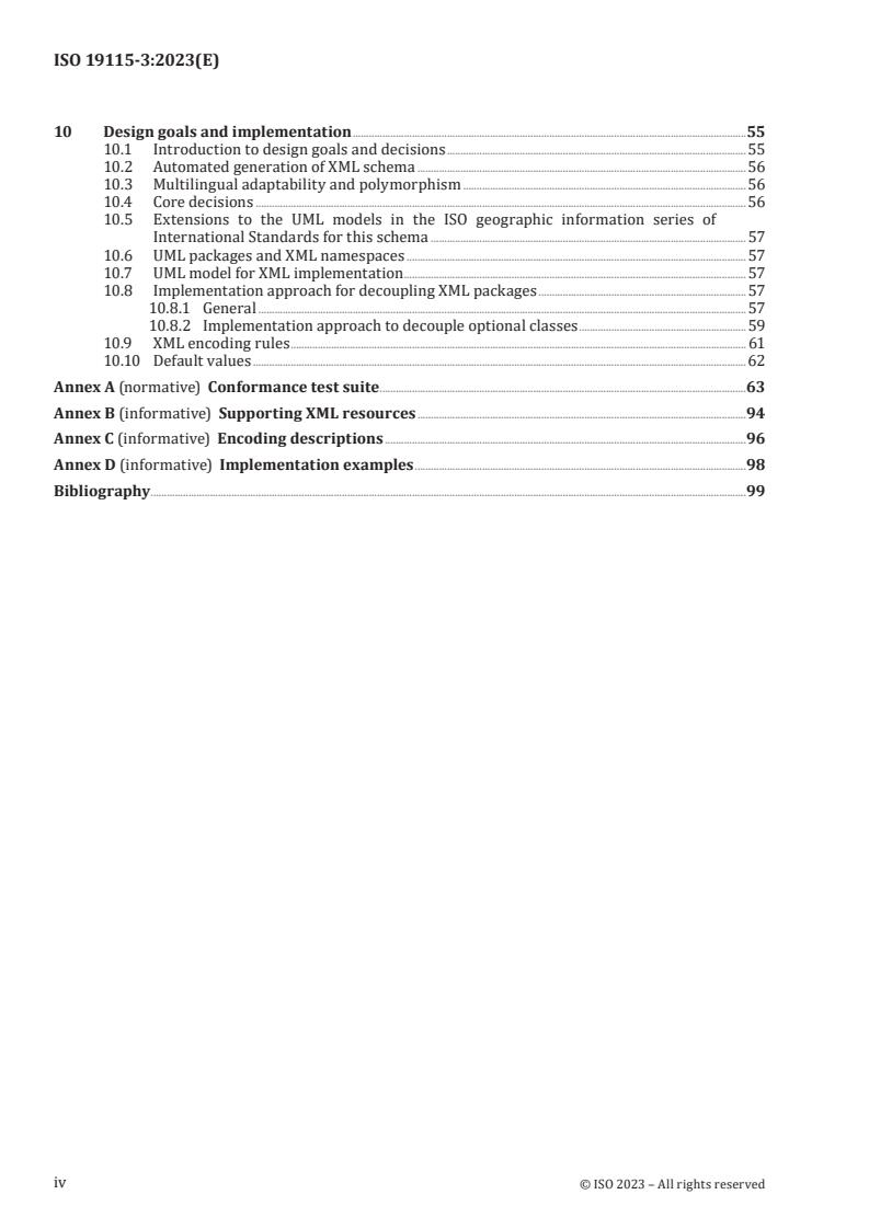 ISO 19115-3:2023 is a standard published by the International Organization for Standardization (ISO). Its full title is "Geographic information - Metadata - Part 3: XML schema implementation for fundamental concepts". This standard covers: This document defines an integrated XML implementation of ISO 19115-1 and ISO 19115-2 by defining the following artefacts: - a set of XML schema required to validate metadata instance documents conforming to conceptual model elements defined in ISO 19115-1 and ISO 19115-2; and - a set of ISO/IEC 19757-3 (Schematron) rules that implement validation constraints in the ISO 19115-1 and ISO 19115-2 UML models that are not validated by the XML schema. This document describes the procedure used to generate XML schemas from ISO geographic information conceptual models related to metadata. The XML schemas are generated directly from the conceptual UML model (8.5).