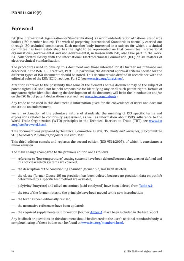 ISO 9514:2019 is a standard published by the International Organization for Standardization (ISO). Its full title is "Paints and varnishes — Determination of the pot life of multicomponent coating systems — Preparation and conditioning of samples and guidelines for testing". This standard covers: This document specifies a method, carried out under standard conditions, for preparing and storing a sample of a multicomponent coating system and subsequently assessing its pot-life by measuring a particular property/ies. Reactive systems curing within a short period of time, e.g. 3 h, will have the end of their pot life so near to the gel point that they will need to be tested for that particular property in accordance with ISO 2535. The method can be carried out either as a pass/fail test by determining the particular property/ies after a specified period of time, or as determination of the pot life by repeating determinations at convenient intervals of time. This document is not intended for in situ control of products during their application. It is intended to determine "pot life" in the laboratory. The value obtained from this test method can be subject to modification by suppliers for practical reasons (e.g. starting temperature) when giving advice to users and should then be called the "practical pot life".