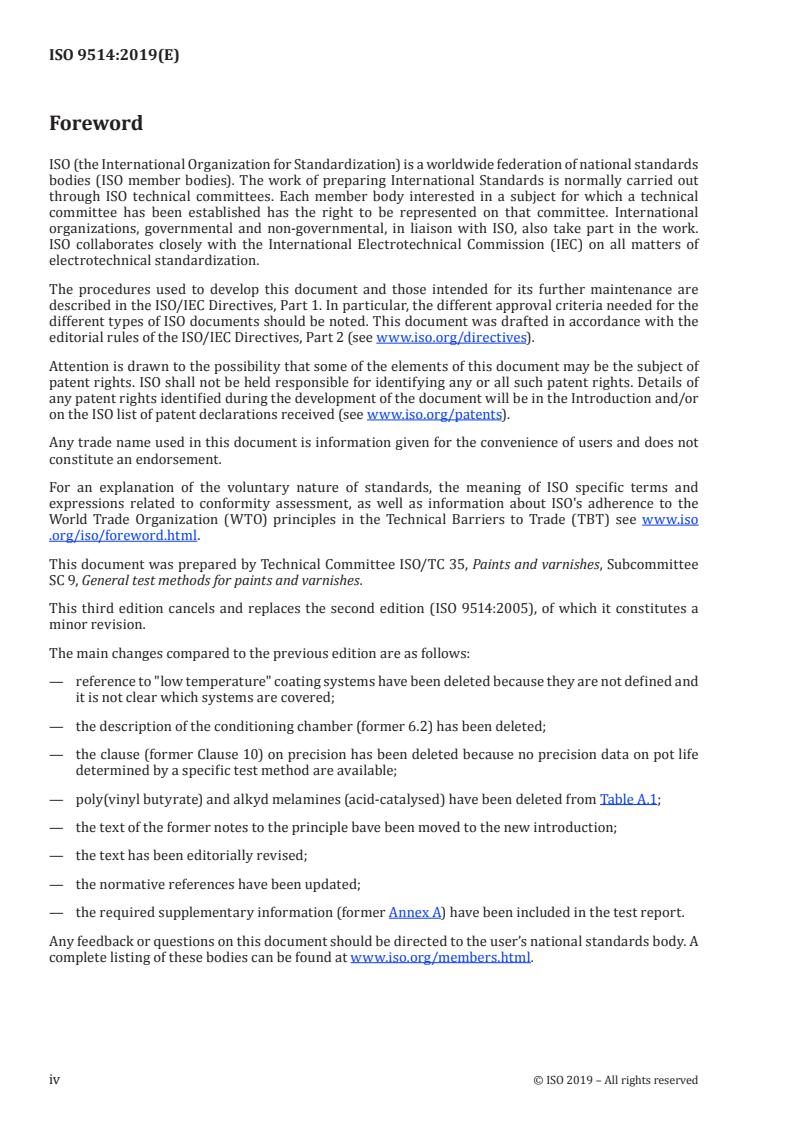 ISO 9514:2019 is a standard published by the International Organization for Standardization (ISO). Its full title is "Paints and varnishes - Determination of the pot life of multicomponent coating systems - Preparation and conditioning of samples and guidelines for testing". This standard covers: This document specifies a method, carried out under standard conditions, for preparing and storing a sample of a multicomponent coating system and subsequently assessing its pot-life by measuring a particular property/ies. Reactive systems curing within a short period of time, e.g. 3 h, will have the end of their pot life so near to the gel point that they will need to be tested for that particular property in accordance with ISO 2535. The method can be carried out either as a pass/fail test by determining the particular property/ies after a specified period of time, or as determination of the pot life by repeating determinations at convenient intervals of time. This document is not intended for in situ control of products during their application. It is intended to determine "pot life" in the laboratory. The value obtained from this test method can be subject to modification by suppliers for practical reasons (e.g. starting temperature) when giving advice to users and should then be called the "practical pot life".