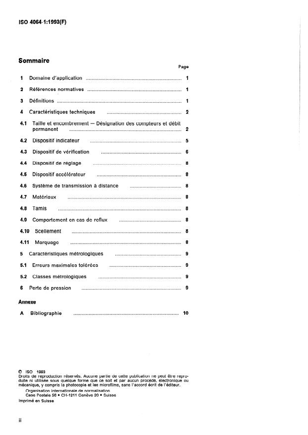 ISO 4064-1:1993 is a standard published by the International Organization for Standardization (ISO). Its full title is "Measurement of water flow in closed conduits — Meters for cold potable water — Part 1: Specifications". This standard covers: Deals with terminology, technical characteristics, metrological characteristics and pressure loss. Applies to water meters of various metrological classes which can withstand permanent flow-rates from 0,6 m^3/h to 4000 m^3/h, maximum admissible working pressures equal to or greater than 10 bar and a maximum admissible temperature of 30 °C. Legal requirements take precedence over the recommendations of this part.
