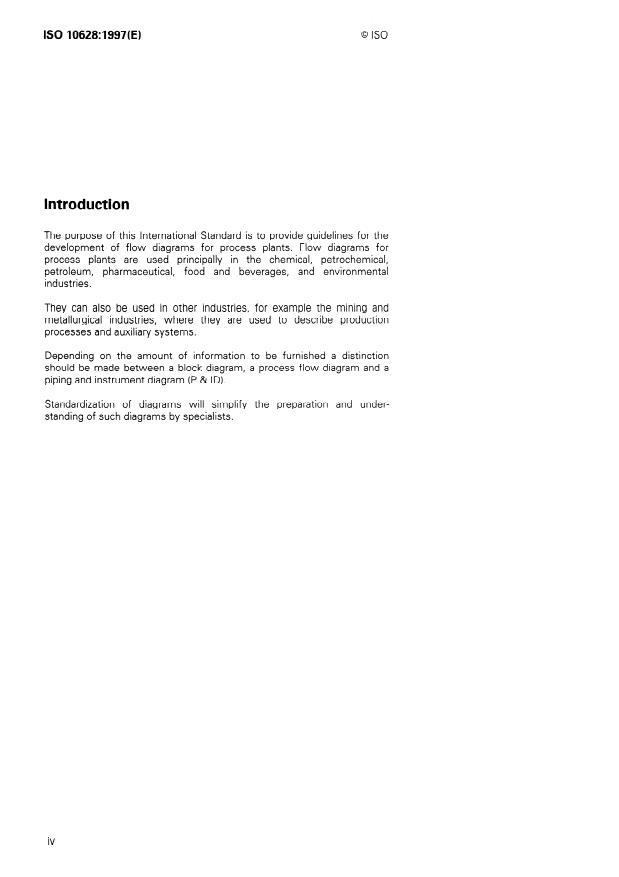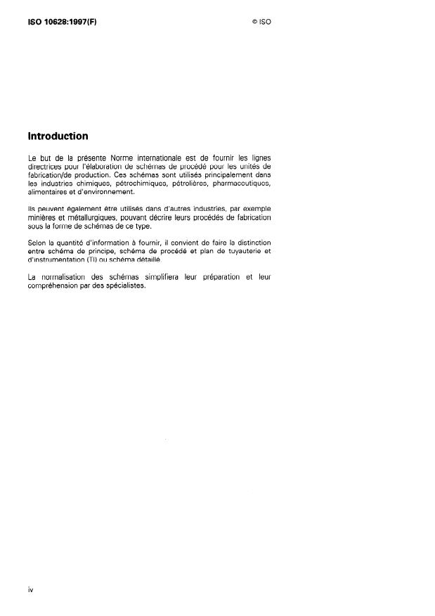 ISO 10628:1997 is a standard published by the International Organization for Standardization (ISO). Its full title is "Flow diagrams for process plants — General rules". This standard covers: La présente Norme internationale établit les règles générales pour l'élaboration de schémas de procédé pour les unités de fabrication/de production. Ces schémas illustrent la configuration et le fonctionnement des usines en question et font partie intégrante de la documentation technique complète nécessaire pour planifier, concevoir, construire, gérer, mettre en service, faire fonctionner, entretenir et mettre hors service une usine. Les schémas de procédé contribuent à simplifier les échanges d'information entre parties intéressées par l'élaboration, la conception, la construction, le fonctionnement et la maintenance de telles usines. La présente Norme internationale n'est pas applicable aux schémas du domaine électrotechnique.