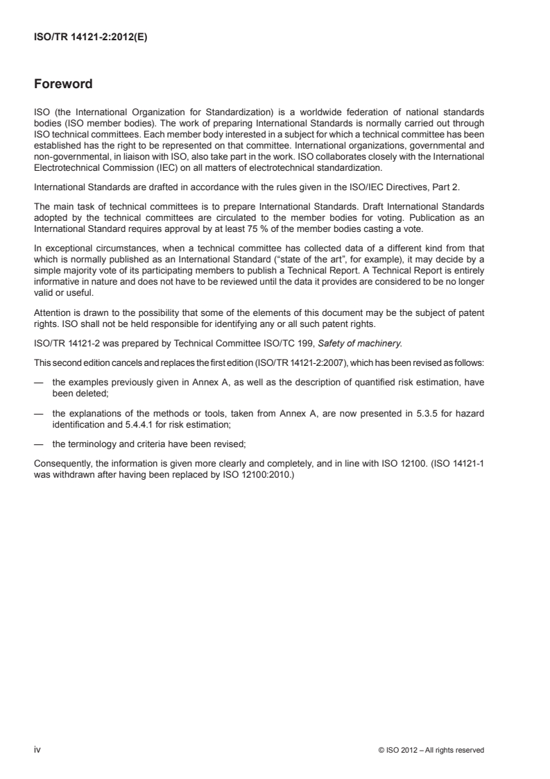 - This report was prepared by ISO/TC 199 (Safety of machinery) and is informative (Technical Report), intended to clarify and expand on ISO 12100 practical implementation.