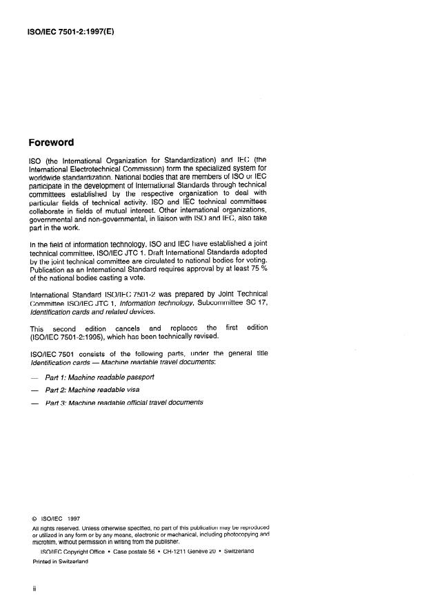 ISO/IEC 7501-2:1997 is a standard published by the International Organization for Standardization (ISO). Its full title is "Identification cards — Machine readable travel documents — Part 2: Machine readable visa". This standard covers: Identification cards — Machine readable travel documents — Part 2: Machine readable visa