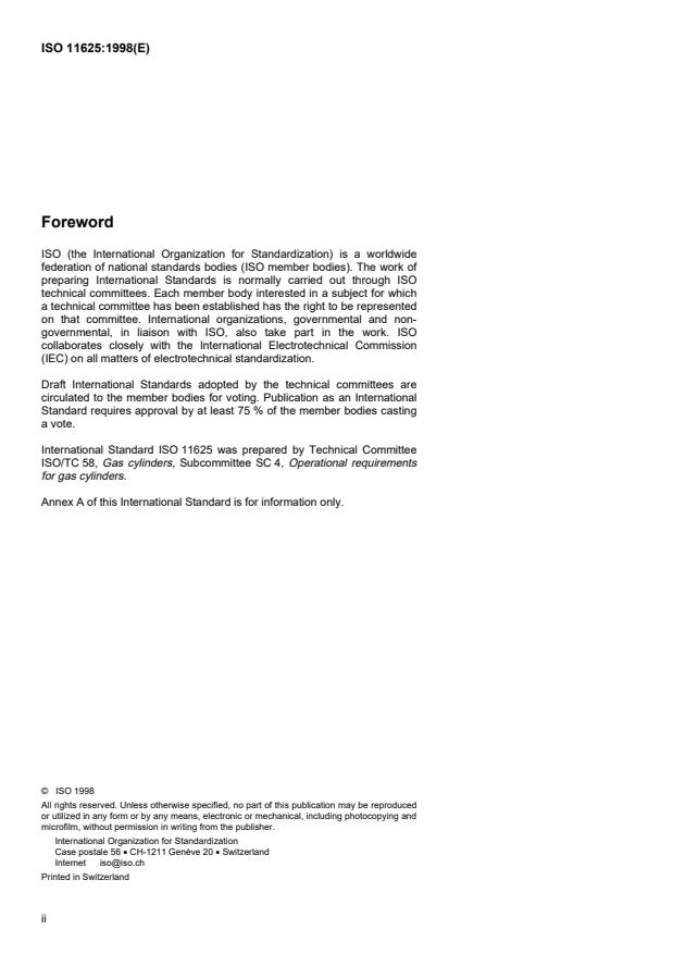 ISO 11625:1998 is a standard published by the International Organization for Standardization (ISO). Its full title is "Gas cylinders — Safe handling". This standard covers: Gas cylinders — Safe handling