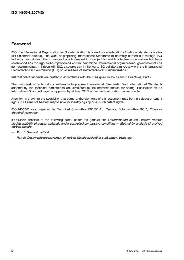 ISO 14855-2:2007 is a standard published by the International Organization for Standardization (ISO). Its full title is "Determination of the ultimate aerobic biodegradability of plastic materials under controlled composting conditions — Method by analysis of evolved carbon dioxide — Part 2: Gravimetric measurement of carbon dioxide evolved in a laboratory-scale test". This standard covers: ISO 14855-2:2007 specifies a method for determining the ultimate aerobic biodegradability of plastic materials under controlled composting conditions by gravimetric measurement of the amount of carbon dioxide evolved. The method is designed to yield an optimum rate of biodegradation by adjusting the humidity, aeration and temperature of the composting vessel. The method applies to the following materials: natural and/or synthetic polymers and copolymers, and mixtures of these; plastic materials that contain additives such as plasticizers or colorants; water-soluble polymers; materials that, under the test conditions, do not inhibit the activity of micro-organisms present in the inoculum.