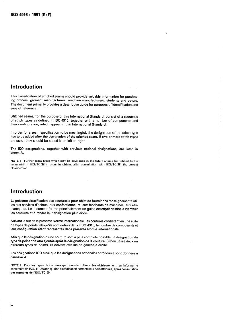 ISO 4916:1991 is a standard published by the International Organization for Standardization (ISO). Its full title is "Textiles — Seam types — Classification and terminology". This standard covers: Classifies, illustrates (the cross-sections of the materials concerned), and designates the various kinds of stitched seams. Should be read in conjunction with ISO 4915. This second edition cancels and replaces the first edition (1982). Annex A forms an integral part of this standard.