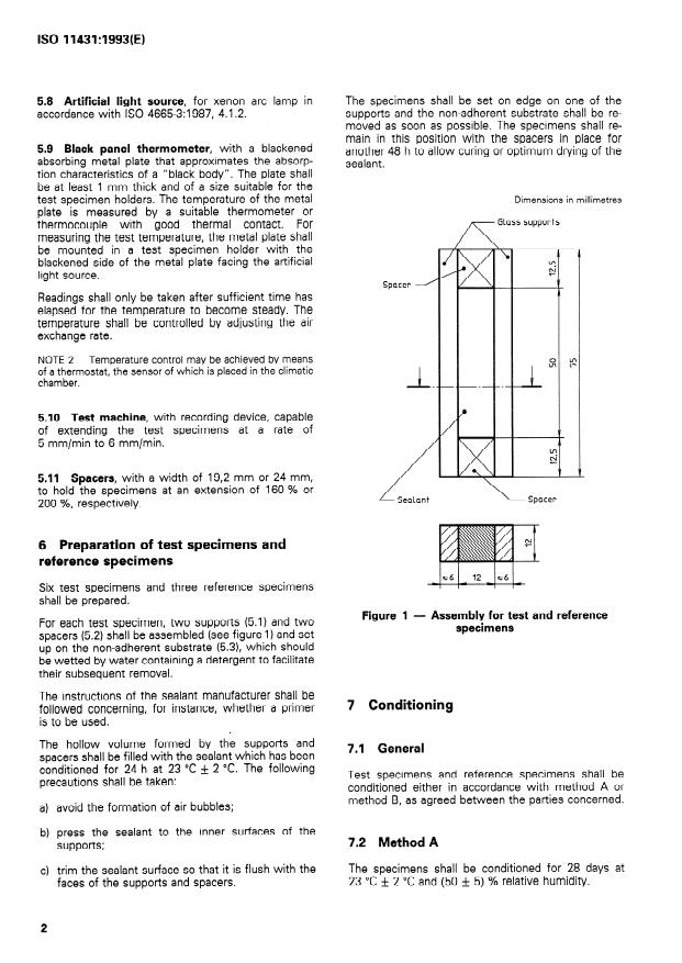ISO 11431:1993 is a standard published by the International Organization for Standardization (ISO). Its full title is "Building construction — Sealants — Determination of adhesion/cohesion properties after exposure to artificial light through glass". This standard covers: The sealants are also exposed to water or humidity, and to elevated temperature. The principle of the method specified is preparing test specimens and reference specimens in which the sealant to be tested adheres to two parallel contact surfaces, submitting the test specimens to the simultaneous influence of artificial light, water or humidity and elevated temperature under defined conditions, extending test specimens and reference specimens to a defined width and, after maintenance of the extension for a defined time, recording any breaks in adhesion or cohesion.