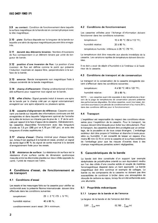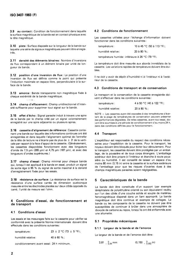 ISO 3407:1983 - Traitement de l'information -- Échange d'information sur cassette de bande magnétique de 3,81 mm (0,150 in) a 4 cpmm (100 cpi), entregistrée par codage de phase a 63 ftpmm (1 600 ftpi)