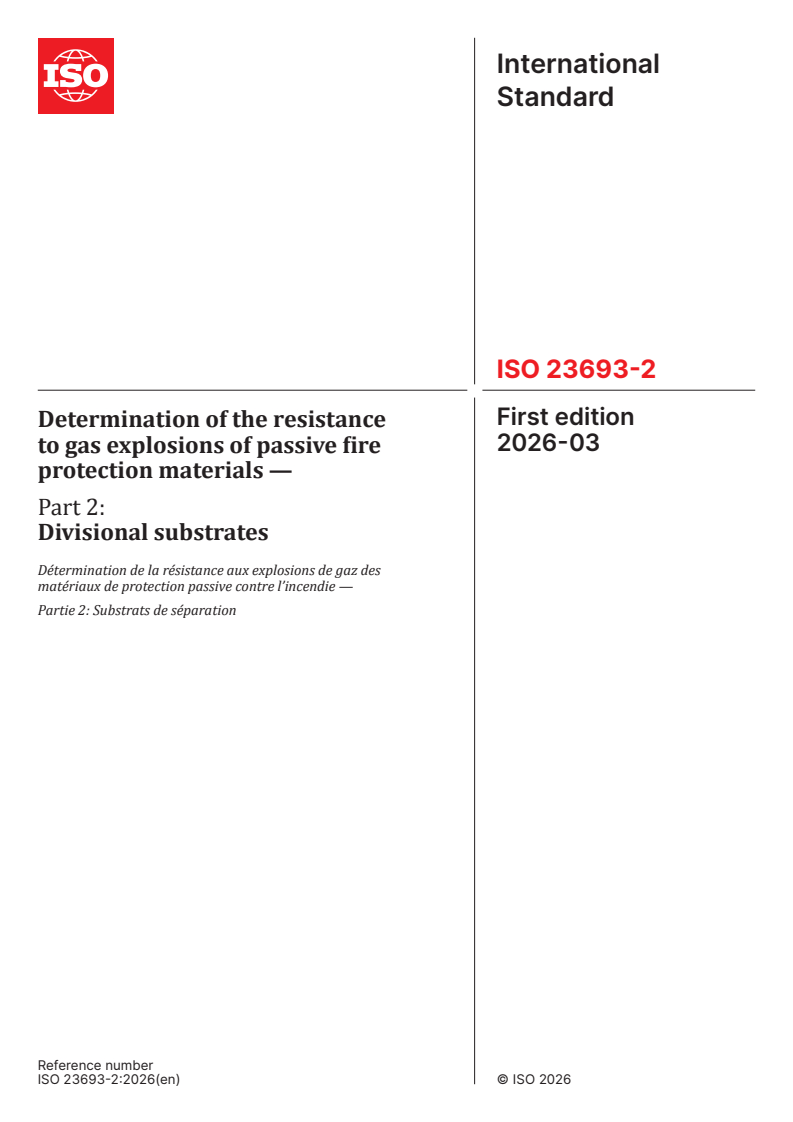 ISO 23693-2:2026 is a standard published by the International Organization for Standardization (ISO). Its full title is "Determination of the resistance to gas explosions of passive fire protection materials — Part 2: Divisional substrates". This standard covers: This document describes methods for simulating the mechanical loads that can be imparted to passive fire protection (PFP) materials and systems by explosions resulting from releases of flammable gas, pressurized liquefied gas, flashing liquid fuels, or dust that can precede a fire. These methods can be used to determine the resistance of passive fire protection materials to such events. This document considers PFP materials applied to panels, plates, etc. that can be used as divisional elements. The loading on this type of element predominantly results from explosion overpressure applied and drag loadings are typically minimal.