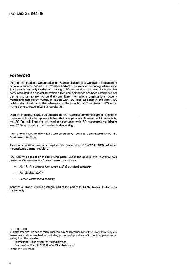 ISO 4392-2:1989 is a standard published by the International Organization for Standardization (ISO). Its full title is "Hydraulic fluid power — Determination of characteristics of motors — Part 2: Startability". This standard covers: This part specifies two test methods for hydraulic motors. Describes two comparable methods of measurement, namely the constant torque method and the constant pressure method. The accuracy of measurements is divided into 3 classes, A, B, and C which are explained in the normative annex A. The normative annex B includes the classes of measurement accuracy, and the normative annex C contains the use of practical units. This second edition cancels and replaces the first edition (1988).