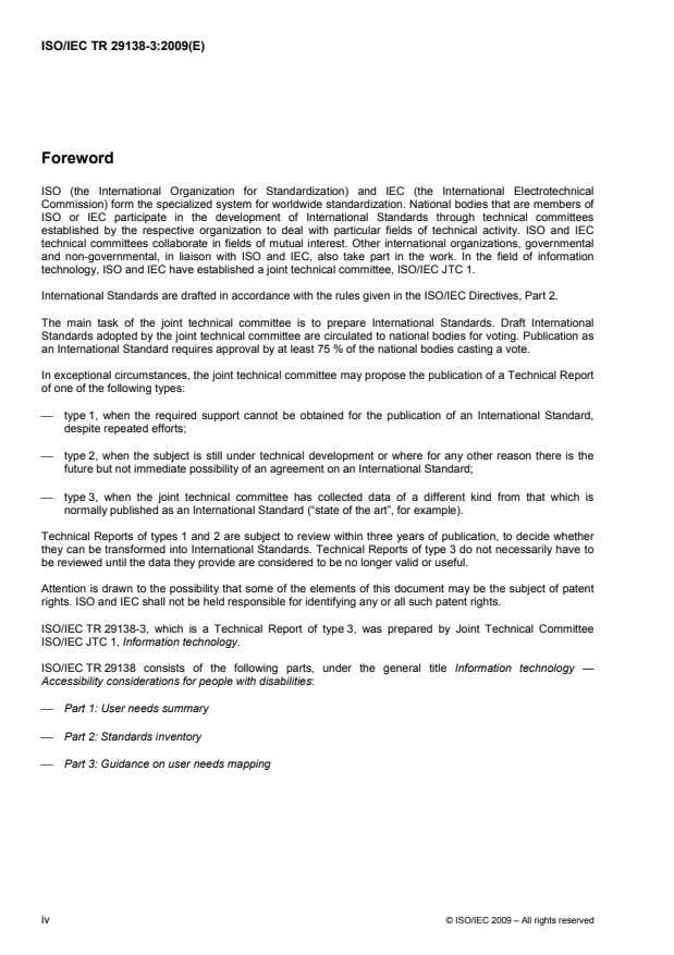 ISO/IEC TR 29138-3:2009 is a technical report published by the International Organization for Standardization (ISO). Its full title is "Information technology — Accessibility considerations for people with disabilities — Part 3: Guidance on user needs mapping". This standard covers: ISO/IEC TR 29136-3:2009 provides guidance on the mapping of the set of user needs with the provisions of a particular standard, technical report, or set of guidelines. It provides both basic guidance that should be used for all user needs mapping and optional guidance that may be added to the basic guidance. User needs mapping is a voluntary activity intended to help improve accessibility for all users and in particular for users with special needs that might otherwise be overlooked. User needs mapping is not intended to be used to evaluate, certify, or otherwise judge a given standard or set of guidelines.