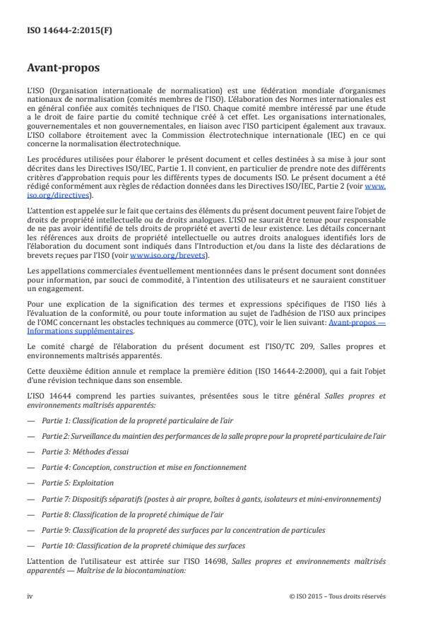 ISO 14644-2:2015 spécifie les exigences minimales d'un plan de surveillance des performances d'une salle propre ou d'une zone propre en lien avec la propreté particulaire de l'air, d'après des paramètres qui mesurent ou modifient la concentration de particules en suspension dans l'air. ISO 14644-2:2015 ne traite pas de la surveillance de l'état dans lequel se trouvent d'autres aspects tels que les vibrations ni de la maintenance générale des systèmes techniques. Elle ne traite pas de la surveillance des populations de particules dont le seuil inférieur se situe en dehors de l'étendue granulométrique de référence de 0,1 µm à 5 µm. Les concentrations de particules ultrafines (plus petites que 0,1 µm) seront traitées dans une norme séparée.