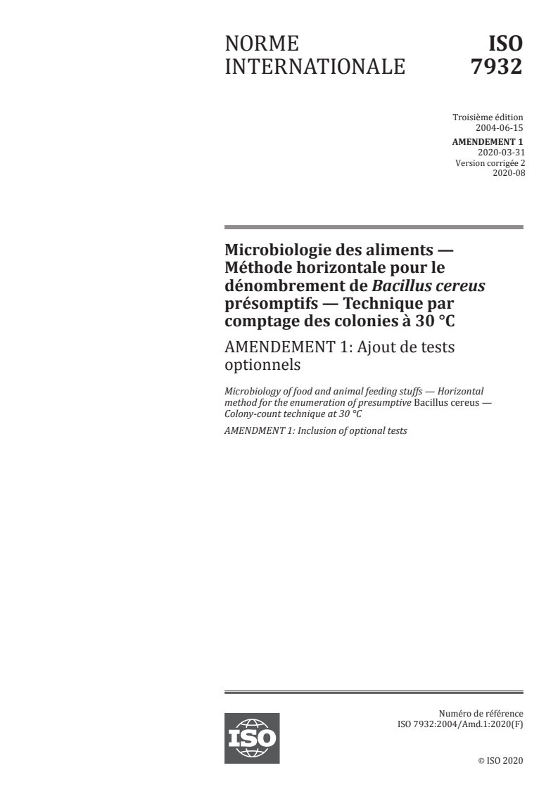ISO 7932:2004/Amd 1:2020 - Microbiologie des aliments — Méthode horizontale pour le dénombrement de Bacillus cereus présomptifs — Technique par comptage des colonies à 30 degrés C — Amendement 1: Ajout de tests optionnels Released:8/5/2020