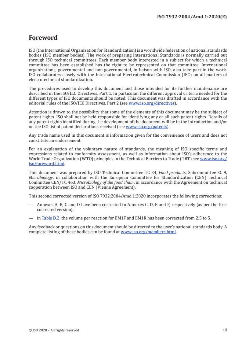 ISO 7932:2004/Amd 1:2020 is an international standard for the microbiology of food and animal feeding stuffs that specifies a horizontal colony‑count technique at 30 °C for the enumeration of presumptive Bacillus cereus. Amendment 1 (2020) supplements the original method by adding optional tests (informative Annexes C–F) for more precise identification and complementary epidemiological investigations of isolates from the B. cereus group.
