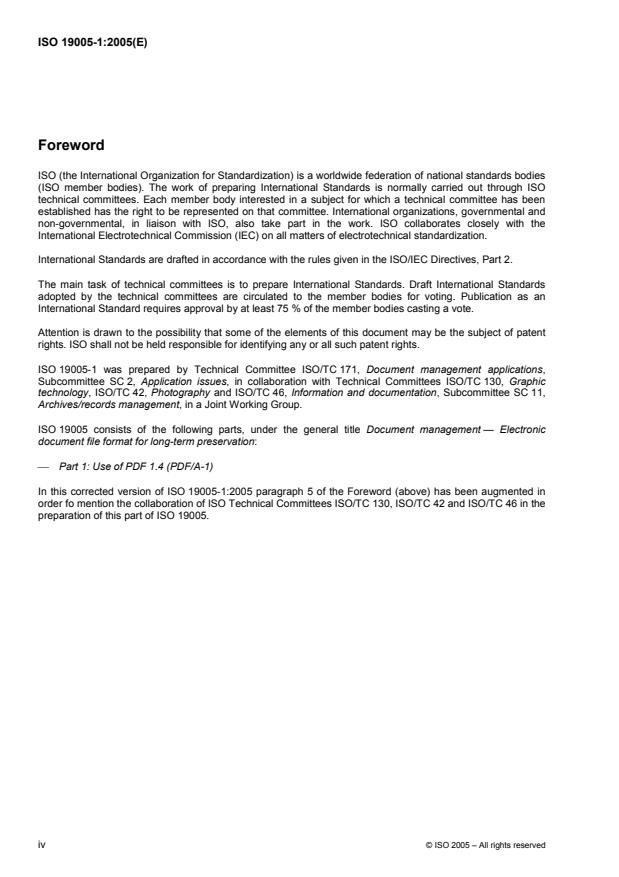 ISO 19005-1:2005 is a standard published by the International Organization for Standardization (ISO). Its full title is "Document management - Electronic document file format for long-term preservation - Part 1: Use of PDF 1.4 (PDF/A-1)". This standard covers: ISO 19005-1:2005 specifies how to use the Portable Document Format (PDF) 1.4 for long-term preservation of electronic documents. It is applicable to documents containing combinations of character, raster and vector data.