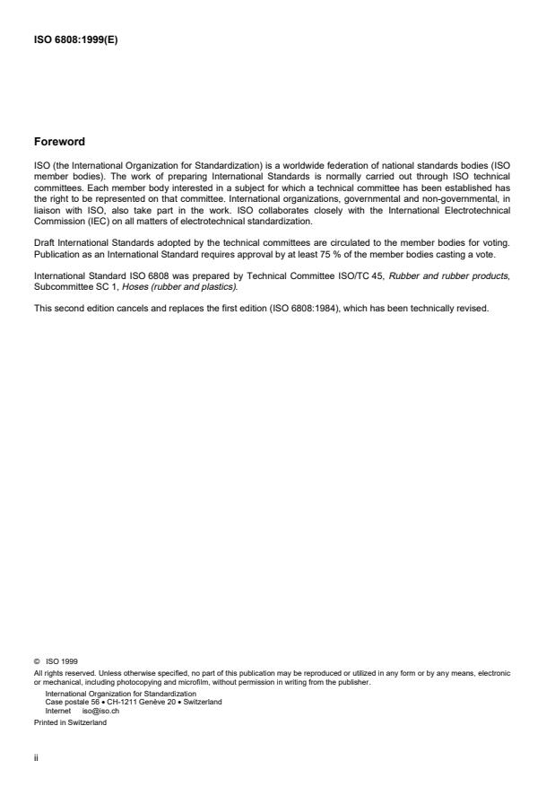 ISO 6808:1999 is a standard published by the International Organization for Standardization (ISO). Its full title is "Plastics hoses and hose assemblies for suction and low-pressure discharge of petroleum liquids — Specification". This standard covers: La présente Norme internationale spécifie les exigences s'appliquant à deux types de tuyaux et flexibles thermoplastiques renforcés de polymère pour aspiration et refoulement de kérosène, fuel, carburant diesel et huiles lubrifiantes dans une gamme de températures comprise entre - 10 °C et + 45 °C. NOTE : Les tuyaux peuvent être stockés de manière statique à une température comprise entre - 30 °C et + 65 °C sans être endommagés par les conditions climatiques.