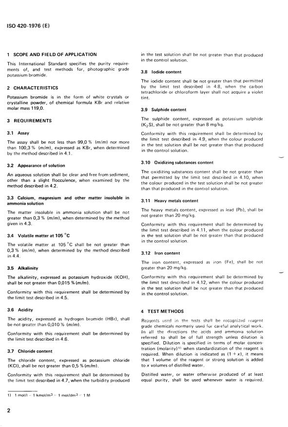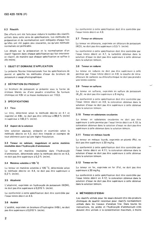 ISO 420:1976 is a standard published by the International Organization for Standardization (ISO). Its full title is "Photographic grade potassium bromide — Specification". This standard covers: Photographic grade potassium bromide — Specification