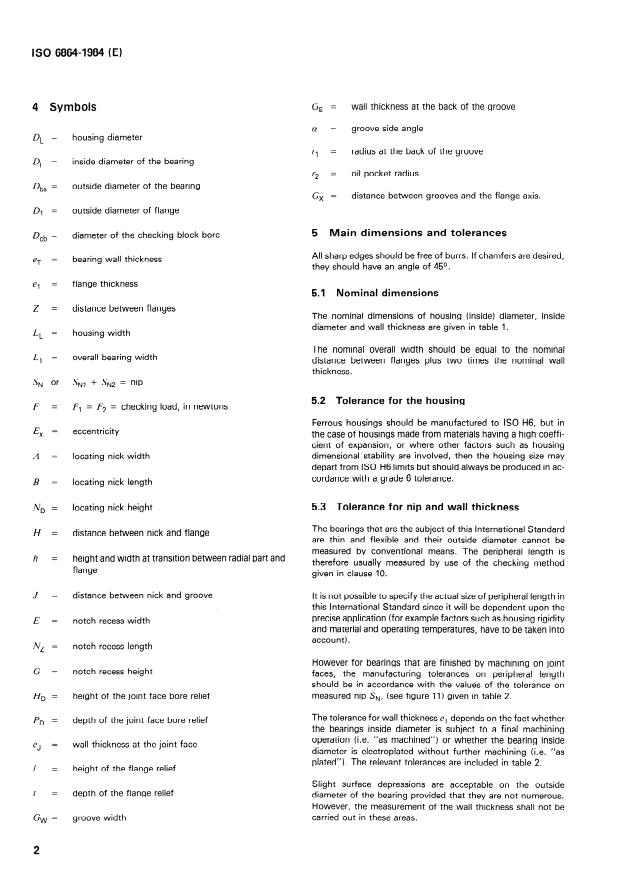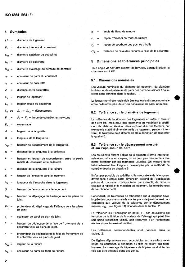 ISO 6864:1984 is a standard published by the International Organization for Standardization (ISO). Its full title is "Plain bearings — Thin-walled flanged half bearings — Dimensions, tolerances and methods of checking". This standard covers: Plain bearings — Thin-walled flanged half bearings — Dimensions, tolerances and methods of checking