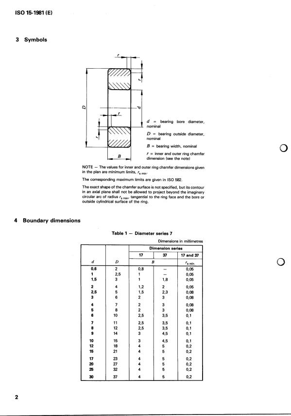 ISO 15:1981 is a standard published by the International Organization for Standardization (ISO). Its full title is "Rolling bearings — Radial bearings — Boundary dimensions — General plan". This standard covers: Rolling bearings — Radial bearings — Boundary dimensions — General plan