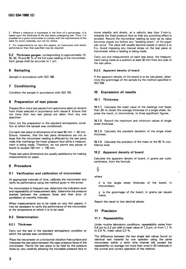 ISO 534:1980 is a standard published by the International Organization for Standardization (ISO). Its full title is "Paper and board — Determination of the thickness of single sheets (and method of calculation of the apparent density of board)". This standard covers: Paper and board — Determination of the thickness of single sheets (and method of calculation of the apparent density of board)