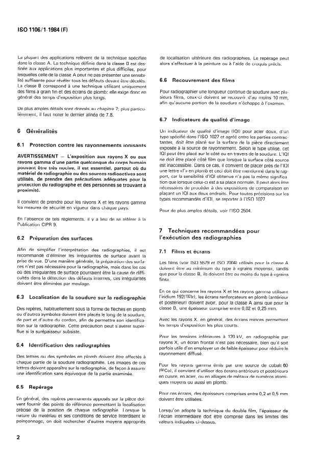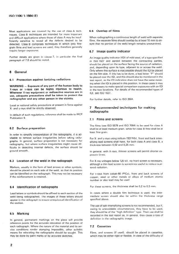 ISO 1106-1:1984 is a standard published by the International Organization for Standardization (ISO). Its full title is "Recommended practice for radiographic examination of fusion welded joints — Part 1: Fusion welded butt joints in steel plates up to 50 mm thick". This standard covers: The detection of flaws in an item submitted to X- or gamma-radiographic examination depends on the particularities of the technique employed. This part of ISO 1106 specifies general techniques of weld radiography with the object of enabling satisfactory results to be obtained economically. The techniques are based on generally accepted practice and the fundamental theory of the subject.
