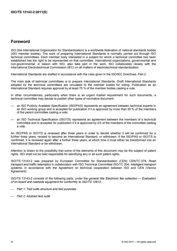 ISO/TS 13143-2:2011 is a technical specification published by the International Organization for Standardization (ISO). Its full title is "Electronic fee collection — Evaluation of on-board and roadside equipment for conformity to ISO/TS 12813 — Part 2: Abstract test suite". This standard covers: ISO/TS 13143-2:2011 specifies the abstract test suite (ATS) to evaluate the conformity of on-board equipment (OBE) and roadside equipment (RSE) to ISO/TS 12813. It provides a basis for conformance tests for dedicated short range communication (DSRC) equipment (on-board units and roadside equipment) to enable interoperability between equipment supplied by different manufacturers. In order to ascertain that OBE and RSE fulfil essential radio requirements, they are also likely to be subject to additional factory, site and system acceptance testing (e.g. of physical and environmental endurance, quality assurance and control at manufacturing, and charge point integration), which is outside the scope of ISO/TS 13143-2:2011.
