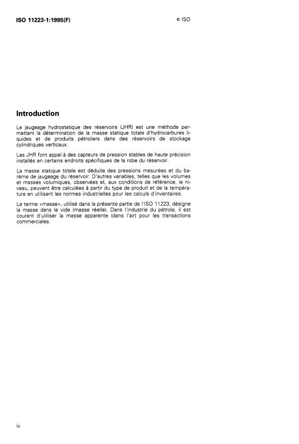 ISO 11223-1:1995 is a standard published by the International Organization for Standardization (ISO). Its full title is "Petroleum and liquid petroleum products — Direct static measurements — Contents of vertical storage tanks — Part 1: Mass measurement by hydrostatic tank gauging". This standard covers: Gives guidance on the installation, commissioning, maintenance, validation and calibration of hydrostatic tank gauging systems for the direct measurement of static mass in petroleum storage tanks.