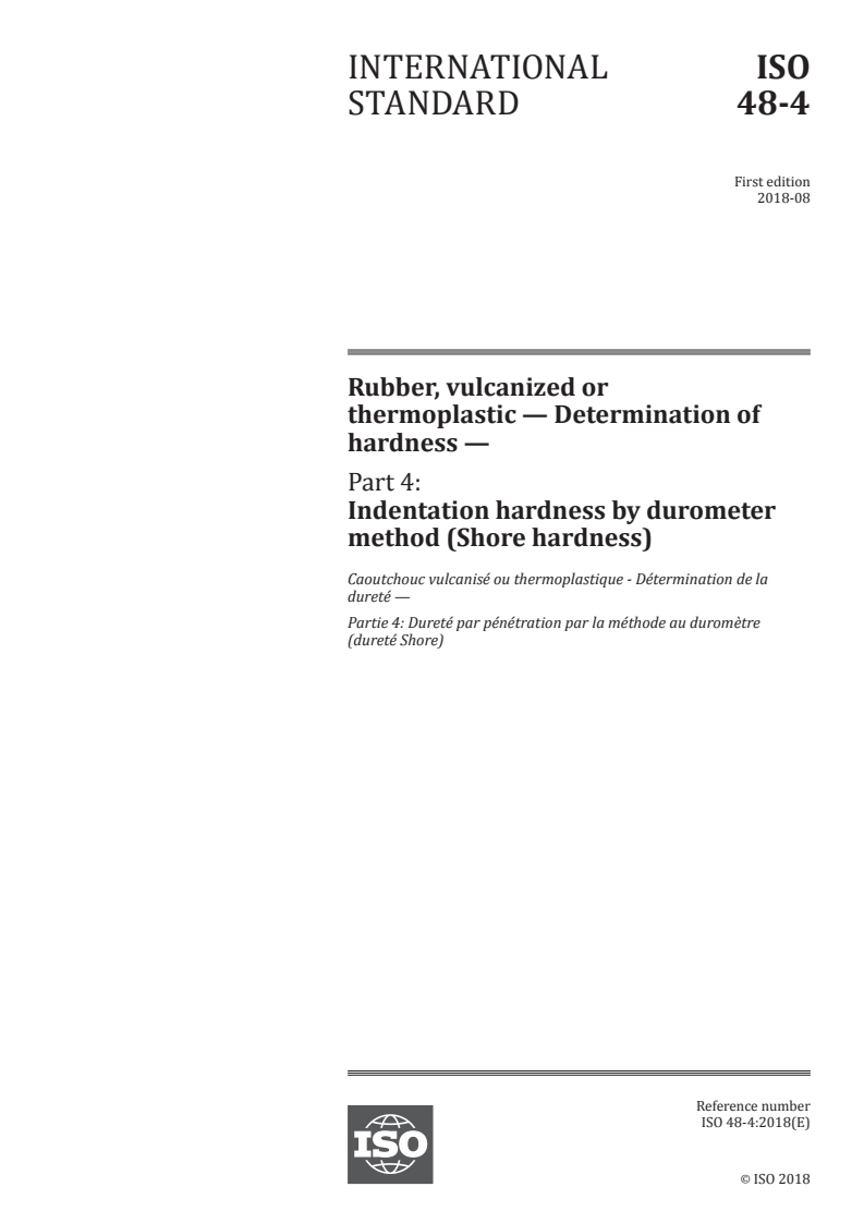 ISO 48-4:2018 - Rubber, vulcanized or thermoplastic — Determination of hardness — Part 4: Indentation hardness by durometer method (Shore hardness) Released:8/20/2018