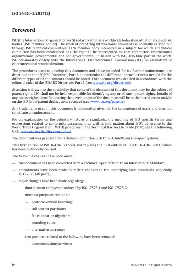 ISO 16410-1:2017 is a standard published by the International Organization for Standardization (ISO). Its full title is "Electronic fee collection — Evaluation of equipment for conformity to ISO 17575-3 — Part 1: Test suite structure and test purposes". This standard covers: The ISO 16410 series provides a suite of tests in order to assess compliance of the Front End and Back End behaviours in relation to the requirements in ISO 17575‑3. ISO 16410-1:2017 contains the definition of such tests in the form of test purposes, listing the required initial conditions, references and individual steps in a structured textual manner. ISO 16410‑2 contains the identical tests written in testing and test control notation version 3 (TTCN v3). The test purposes defined in ISO 16410-1:2017 reflect the structural and semantic requirements stated in ISO 17575‑3. - Presence/absence of particular data elements (see ISO 17575‑3:2016, 8.5.5); - Semantics related to various data elements, e.g.: - Activation of context data and handling multiple contexts (see ISO 17575‑3:2016, 8.3); - Handling the precedence and priority levels (see ISO 17575‑3:2016, 8.5.2 to 8.5.4); - Uniqueness of relevant data elements (see ISO 17575‑3:2016, 8.5.2 to 8.5.4); - Correct definition of the charge objects (see ISO 17575‑3:2016, 8.5.4); - Fee calculation algorithm (see ISO 17575‑3:2016, 8.5.3.7); - Security (see ISO 17575‑3:2016, 7.2). With regard to the individual data sets and EFC attributes defined in ISO 17575‑3, the test purposes have been organized into the test suite groups, designated for the Front End and Back End respectively. In addition to the test purposes, ISO 16410-1:2017 also provides proforma conformance test report templates for both the Front End and Back End test purposes and an informative statement on the usage of ISO 16410-1:2017 for the European electronic toll service (EETS). For more information regarding the requirements against which the conformance is evaluated in ISO 16410-1:2017, refer to ISO 17575‑3. Testing of the following behaviours and functionalities is outside the scope of ISO 16410-1:2017: - dynamic behaviour, i.e. sequence of messages and triggering events that must be exchanged/happen to fulfil certain charging scenarios; - profiles and business logic built on top of particular pricing schemas; - behaviour invalid of Front End and Back End, BI test purposes are not applicable for any test purpose group (as ISO 17575‑3 does not specify behaviour invalid).