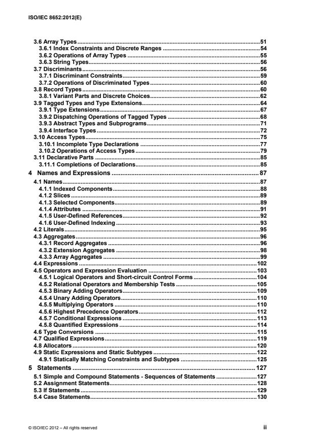 ISO/IEC 8652:2012 is a standard published by the International Organization for Standardization (ISO). Its full title is "Information technology — Programming languages — Ada". This standard covers: ISO/IEC 8652:2012 specifies the form and meaning of programs written in the programming language Ada. Its purpose is to promote the portability of Ada programs to a variety of computing systems. This third edition of ISO/IEC 8652 focuses on improvements in those user domains where safety and criticality are prime concerns. It enhances the functionality of containers, improves the ability to write and enforce contracts for Ada entities (for instance, via preconditions), and adds to the capabilities of Ada to perform on multicore and multithreaded architectures. Ada is designed to support the construction of long‐lived, highly reliable software systems. The language includes facilities to define packages of related types, objects, and operations. The packages may be parameterized and the types may be extended to support the construction of libraries of reusable, adaptable software components. The operations may be implemented as subprograms using conventional sequential control structures, or as entries that include synchronization of concurrent threads of control as part of their invocation. Ada supports object‐oriented programming by providing classes and interfaces, inheritance, polymorphism of variables and methods, and generic units. The language treats modularity in the physical sense as well, with a facility to support separate compilation. The language provides rich support for real‐time, concurrent programming, and includes facilities for multicore and multiprocessor programming. Errors can be signaled as exceptions and handled explicitly. The language also covers systems programming; this requires precise control over the representation of data and access to system‐dependent properties. Finally, a predefined environment of standard packages is provided, including facilities for, among others, input‐output, string manipulation, numeric elementary functions, random number generation, and definition and use of containers. Foremost in the design of Ada is the intent to increase the reliability of programs by compiletime checking and rejection of unsafe programs.