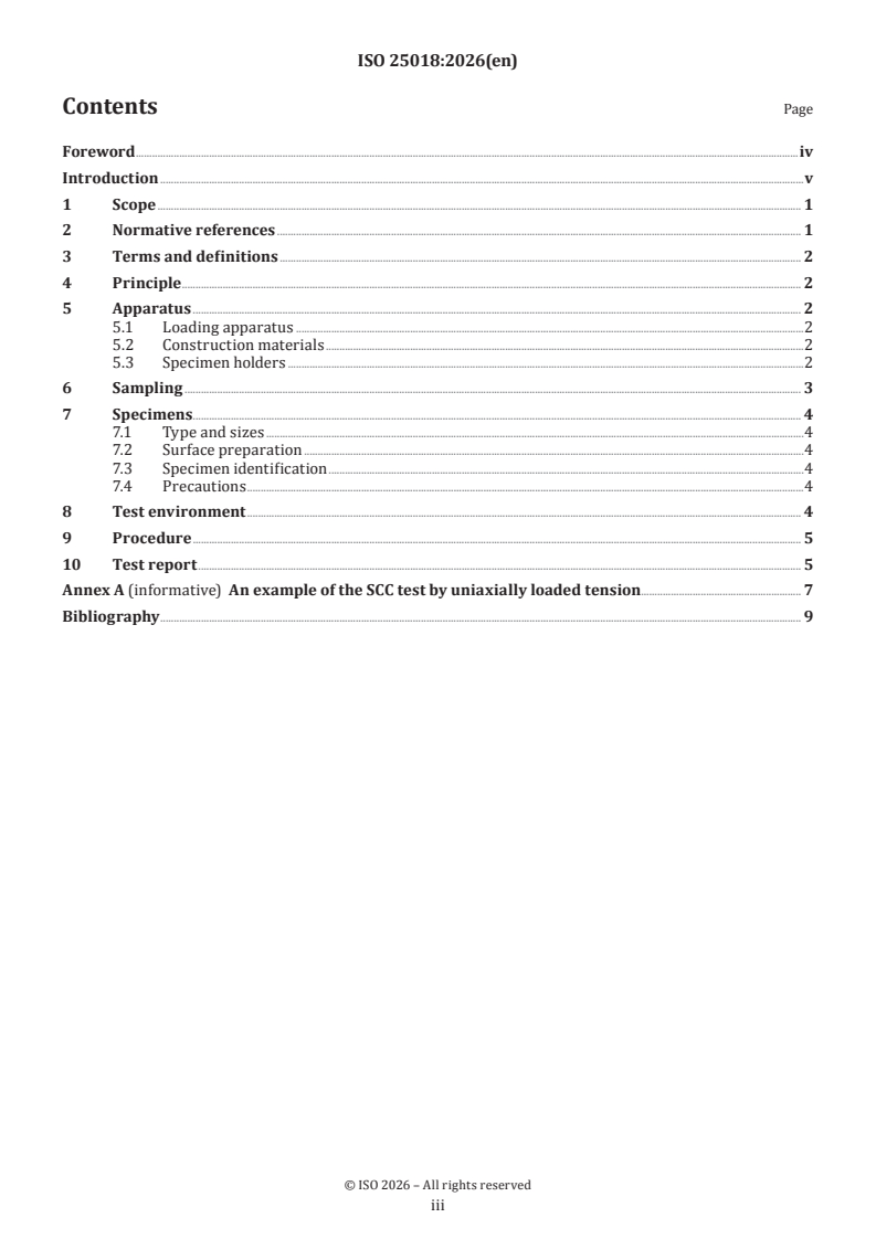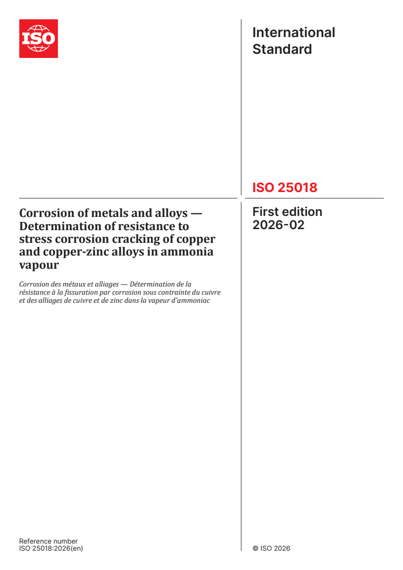 ISO 25018:2026 is a standard published by the International Organization for Standardization (ISO). Its full title is "Corrosion of metals and alloys — Determination of resistance to stress corrosion cracking of copper and copper-zinc alloys in ammonia vapour". This standard covers: This document specifies a method for the determination of resistance to stress corrosion cracking (SCC) of copper and copper-zinc alloys in ammonia vapour. This document covers the method of sampling, the types of specimens, the loading procedure, the type of environment and the interpretation of results. This document is aimed at determining resistance to SCC as a function of the chemical composition, the method of manufacture of copper and copper-zinc alloys. This document applies to wrought copper and copper-zinc alloys in the form of products and parts. This document can be used to rank materials performance and select candidate materials under atmospheres containing ammonia. However, the results of this test should not be considered as an absolute criterion for the quality of alloys. This document specifies a method for exposing test specimens in ammonia vapour coexisting with an aqueous ammonia solution and specifies the environmental conditions and test procedures. This document specifies two methods of loading: under constant total strain; under constant load. It does not cover slow strain rate test methods and determination of maximum admissible stress by the method of permanent deformation for copper and copper-zinc alloys, although an effort is now being made to apply such methods to these alloys (see ISO 7539-7).