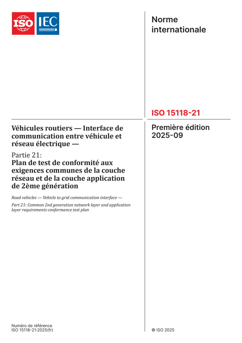 ISO 15118-21:2025 - Véhicules routiers — Interface de communication entre véhicule et réseau électrique — Partie 21: Plan de test de conformité aux exigences communes de la couche réseau et de la couche application de 2eme génération Released:3. 02. 2026