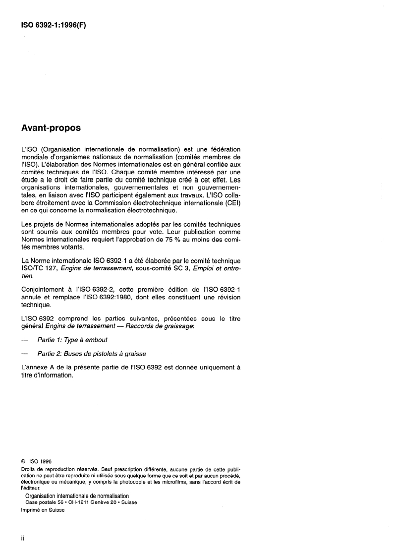 ISO 6392-1:1996 - Engins de terrassement — Raccords de graissage — Partie 1: Type à embout Released:11/21/1996