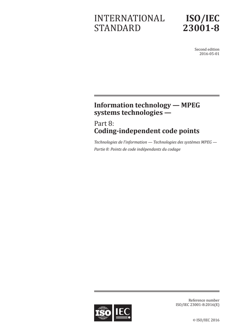 ISO/IEC 23001-8:2016 is a standard published by the International Organization for Standardization (ISO). Its full title is "Information technology - MPEG systems technologies - Part 8: Coding-independent code points". This standard covers: ISO/IEC 23001-8:2016 defines various code points and fields that establish properties of a video or audio stream that are independent of the compression encoding and bit rate. These properties may describe the appropriate interpretation of decoded video or audio data or may, similarly, describe the characteristics of such signals before the signal is compressed by an encoder that is suitable for compressing such an input signal.