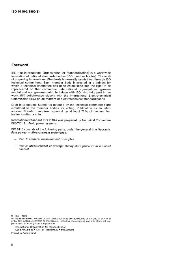 ISO 9110-2:1990 is a standard published by the International Organization for Standardization (ISO). Its full title is "Hydraulic fluid power — Measurement techniques — Part 2: Measurement of average steady-state pressure in a closed conduit". This standard covers: Establishes procedures for measuring the average steady-state pressure in a hydraulic fluid power conduit. Applies to the measurement in closed conduits with inside diameters greater than 3 mm, transmitting hydraulic fluid with velocities less than 25 m/s and pressures less than 70 MPa.