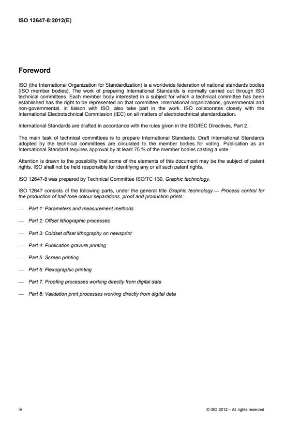 ISO 12647-8:2012 is a standard published by the International Organization for Standardization (ISO). Its full title is "Graphic technology — Process control for the production of half-tone colour separations, proof and production prints — Part 8: Validation print processes working directly from digital data". This standard covers: ISO 12647-8:2012 specifies requirements that can be used for determining the conformance of systems that produce a hard-copy validation print, directly from digital data, which is intended to simulate the expected appearance of material printed in accordance with a characterized printing condition. ISO 12647-8:2012 is not intended for use in determining the conformance of production printing systems (digital or conventional) since many aspects of production printing are not covered.