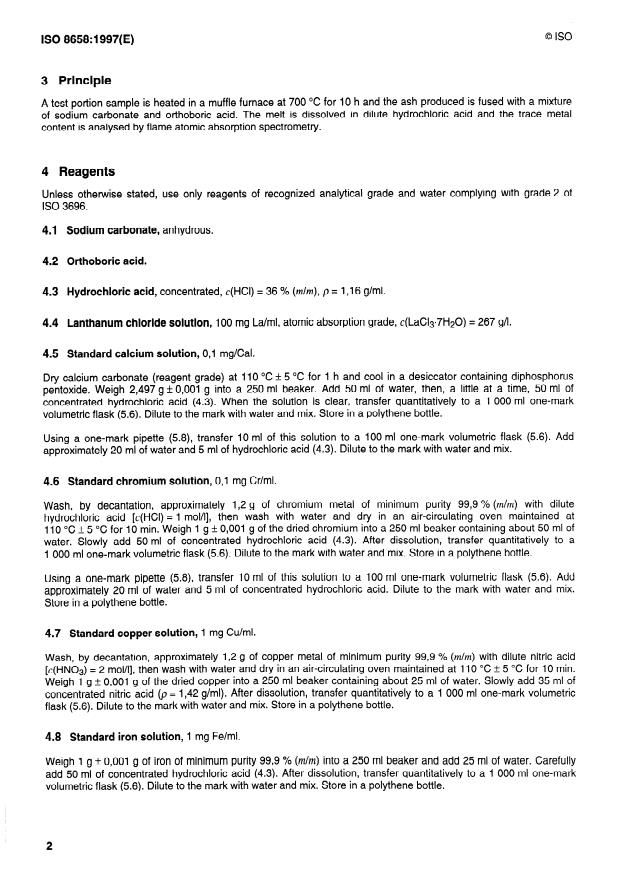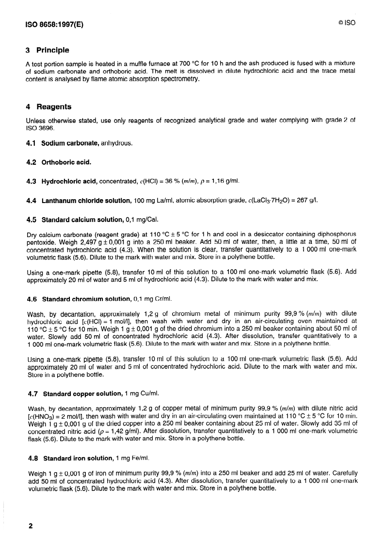 - Apparatus and reagents: specifies platinum crucibles, Meker burner, spectrometer, analytical-grade reagents and water complying with ISO 3696 (grade 2).