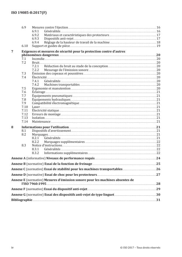 ISO 19085-8:2017 donne les exigences et les mesures de sécurité pour les machines de calibrage et de ponçage fixes, à avance intégrée et munies d'une ou plusieurs unités de ponçage à bande positionnées au-dessus et/ou au-dessous du niveau de la pièce, à chargement et/ou déchargement manuel ou automatique, ci-après désignées «machines». ISO 19085-8:2017 traite de tous les phénomènes dangereux, situations et événements dangereux significatifs, tels qu'énumérés à l'Article 4, applicables aux machines lorsqu'elles sont utilisées, réglées et entretenues comme prévu et dans les conditions prévues par le fabricant, incluant une mauvaise utilisation raisonnablement prévisible. Les phases de transport, d'assemblage, de démontage, de mise hors service et de mise au rebut ont également été prises en compte. NOTE 1 Pour les phénomènes dangereux pertinents mais non significatifs, par exemple, les arêtes vives du bâti de la machine, voir l'ISO 12100:2010. ISO 19085-8:2017 est également applicable aux machines équipées d'un ou plusieurs des dispositifs/unités de travail supplémentaires suivants, dont les phénomènes dangereux ont été traités: - unité de ponçage transversale; - unité de nettoyage par brossage; - unité de satinage à rouleau; - unité de brossage à disques; - unité à texturer à rouleau de brossage; - unité à texturer à bande de brossage; - unité porte-outil; - unité à texturer à scie à ruban; - unité de rouleau à pointes; - barres antistatiques; - convoyeur directement commandé par la machine; - dispositif de bridage supplémentaire de la pièce par dépression. Les machines sont conçues pour calibrer et/ou pour poncer des pièces, sous la forme de panneaux ou de faisceaux constitués de: a) bois massif; b) matériau présentant des caractéristiques physiques similaires à celles du bois (voir l'ISO 19085‑1:2017, 3.2); c) panneaux en plâtre, panneaux en fibres agglomérées au plâtre; d) matériaux composites dont la base est constituée, par exemple, de polyuréthane ou d'un matériau minéral; e) panneaux en composite fabriqués à partir des matériaux énumérés ci-dessus; f) tous les matériaux énumérés ci-dessus, également déjà laqués. ISO 19085-8:2017 ne traite pas des phénomènes dangereux relatifs à: - des dispositifs spécifiques autres que ceux énumérés ci-dessus; - l'accès par les ouvertures d'entrée et de sortie des machines ayant une capacité de hauteur de pièce supérieure à 550 mm; - des systèmes pour le chargement et/ou déchargement automatique de la pièce d'une machine individuelle; NOTE 2 Le chargement manuel de la machine comprend la mise en place manuelle de la pièce sur un convoyeur directement commandé par la machine. Le déchargement manuel de la machine comprend le retrait manuel de la pièce d'un convoyeur directement commandé par la machine. ? interface entre la machine et une autre machine. ISO 19085-8:2017 n'est pas applicable aux machines prévues pour une utilisation en atmosphère explosible, ni aux machines fabriquées avant sa date de publication.