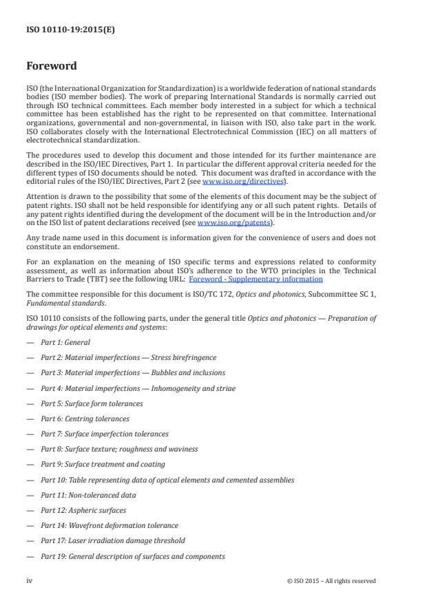 ISO 10110-19:2015 is a standard published by the International Organization for Standardization (ISO). Its full title is "Optics and photonics - Preparation of drawings for optical elements and systems - Part 19: General description of surfaces and components". This standard covers: ISO 10110-19:2015 specifies the presentation of design and functional requirements for optical elements and systems in technical drawings used for manufacture and inspection. ISO 10110-19:2015 provides a general method of describing surfaces and components. This part of ISO 10110 applies to continuous and discontinuous surfaces. It does not apply to diffractive surfaces, Fresnel surfaces, ophthalmic glasses, and micro-optical surfaces. ISO 10110-19:2015 applies to any general surface or component, even including spherical or rotationally symmetric surfaces if it is necessary, i.e. when NURBS, splines, point clouds, etc. are used. ISO 10110-19:2015 does not specify the method by which compliance with the specifications is to be tested.
