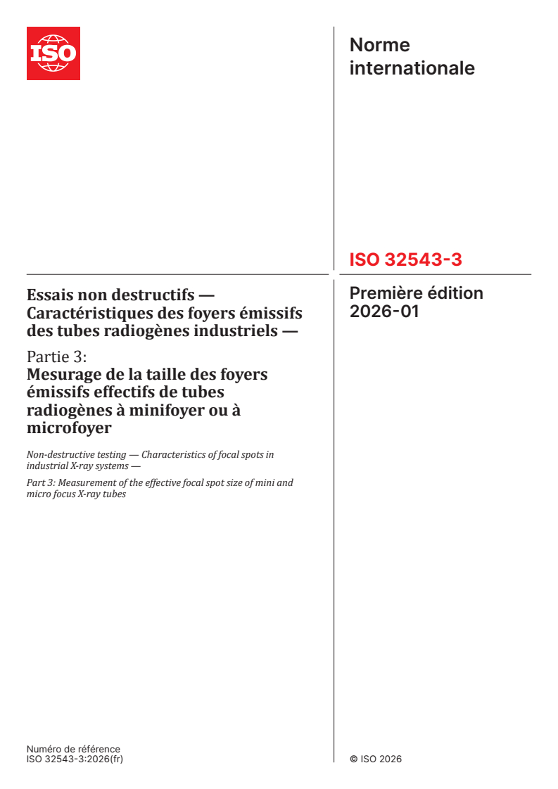 ISO 32543-3:2026 - Essais non destructifs — Caractéristiques des foyers émissifs des tubes radiogènes industriels — Partie 3: Mesurage de la taille des foyers émissifs effectifs de tubes radiogènes à minifoyer ou à microfoyer Released:9. 01. 2026