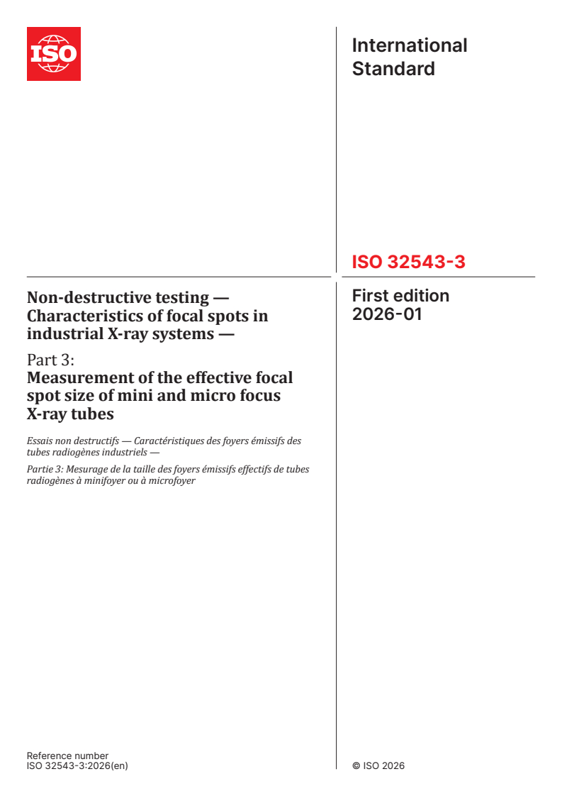 ISO 32543-3:2026 - Non-destructive testing — Characteristics of focal spots in industrial X-ray systems — Part 3: Measurement of the effective focal spot size of mini and micro focus X-ray tubes Released:9. 01. 2026