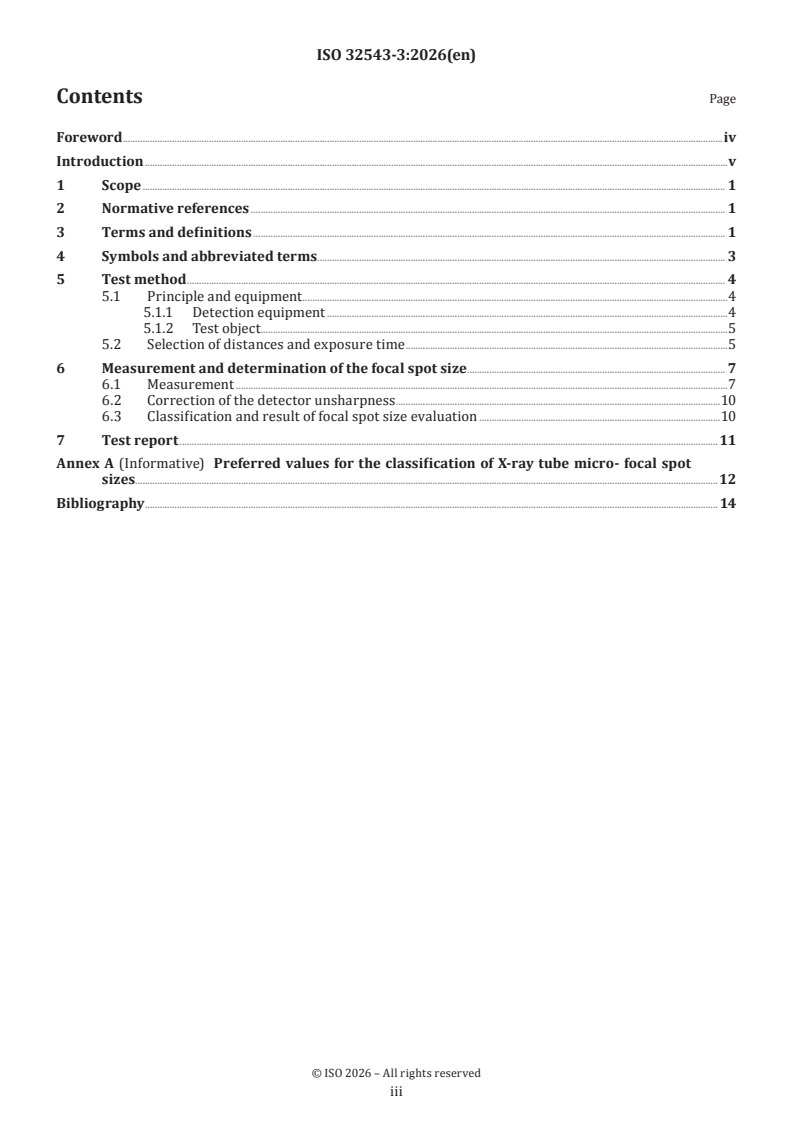 ISO 32543-3:2026 is a standard published by the International Organization for Standardization (ISO). Its full title is "Non-destructive testing — Characteristics of focal spots in industrial X-ray systems — Part 3: Measurement of the effective focal spot size of mini and micro focus X-ray tubes". This standard covers: This document specifies a method for the measurement of focal spot sizes within the range of 5 µm to 300 µm of X-ray systems up to and including 225 kV tube voltage. This determination is based on the evaluation of an image with a dedicated focal spot that has been radiographically recorded using an edge and evaluated with a digital method. The imaging quality and the resolution of X-ray images depend highly on the characteristics of the effective focal spot, in particular its size and the two-dimensional intensity distribution as seen from the detector plane. For the characterization of commercial X-ray tube types (i.e. for advertising or trade), the nominal values of Annex A are preferred. NOTE The same procedure can be used at higher kilovoltages by agreement but the accuracy of the measurement can be poorer.