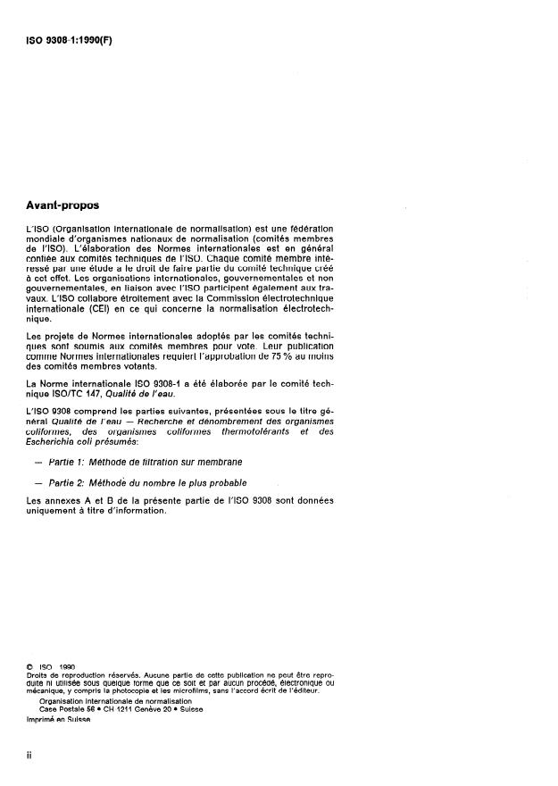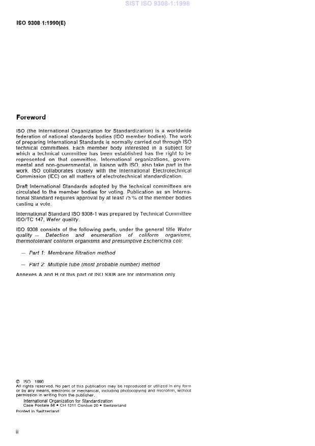 ISO 9308-1:1990 is a standard published by the International Organization for Standardization (ISO). Its full title is "Water quality — Detection and enumeration of coliform organisms, thermotolerant coliform organisms and presumptive Escherichia coli — Part 1: Membrane filtration method". This standard covers: Water quality — Detection and enumeration of coliform organisms, thermotolerant coliform organisms and presumptive Escherichia coli — Part 1: Membrane filtration method