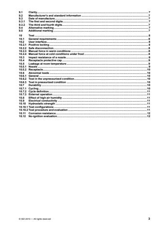 - Performance testing: Leakage tests at room temperature, hydrostatic strength, durability/cycling (receptacles tested to 10 000 connect/disconnect cycles; Class A nozzles defined for high-frequency use at 100 000 cycles), abnormal-load tests, electrical conductivity and no-ignition evaluation.