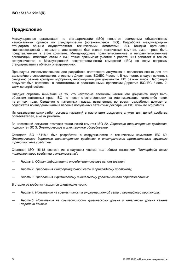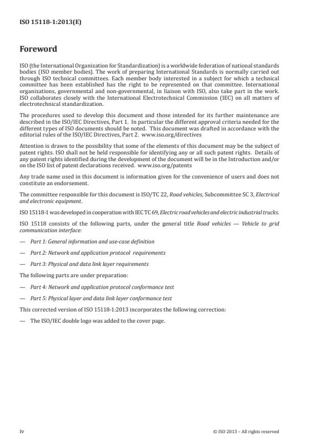 ISO 15118 specifies the communication between Electric Vehicles (EV), including Battery Electric Vehicles and Plug-In Hybrid Electric Vehicles, and the Electric Vehicle Supply Equipment (EVSE). As the communication parts of this generic equipment are the Electric Vehicle Communication Controller (EVCC) and the Supply Equipment Communication Controller (SECC), ISO 15118 describes the communication between these components. Although ISO 15118 is oriented to the charging of electric road vehicles, it is open for other vehicles as well. ISO 15118-1:2013 specifies terms and definitions, general requirements and use cases as the basis for the other parts of ISO 15118. It provides a general overview and a common understanding of aspects influencing the charge process, payment and load levelling. ISO 15118 does not specify the vehicle internal communication between battery and charging equipment and the communication of the SECC to other actors and equipment (beside some dedicated message elements related to the charging). All connections beyond the SECC, and the method of message exchanging are considered to be out of the scope as specific use cases.